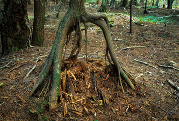 Over time, the nurse log decays and the new tree stands on roots like stilts when the old support is gone:
